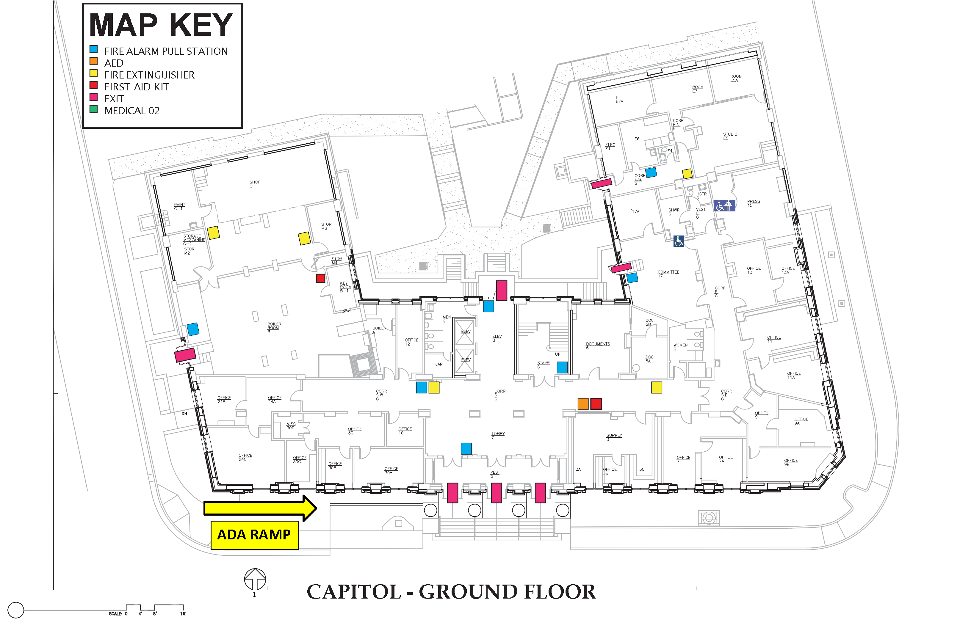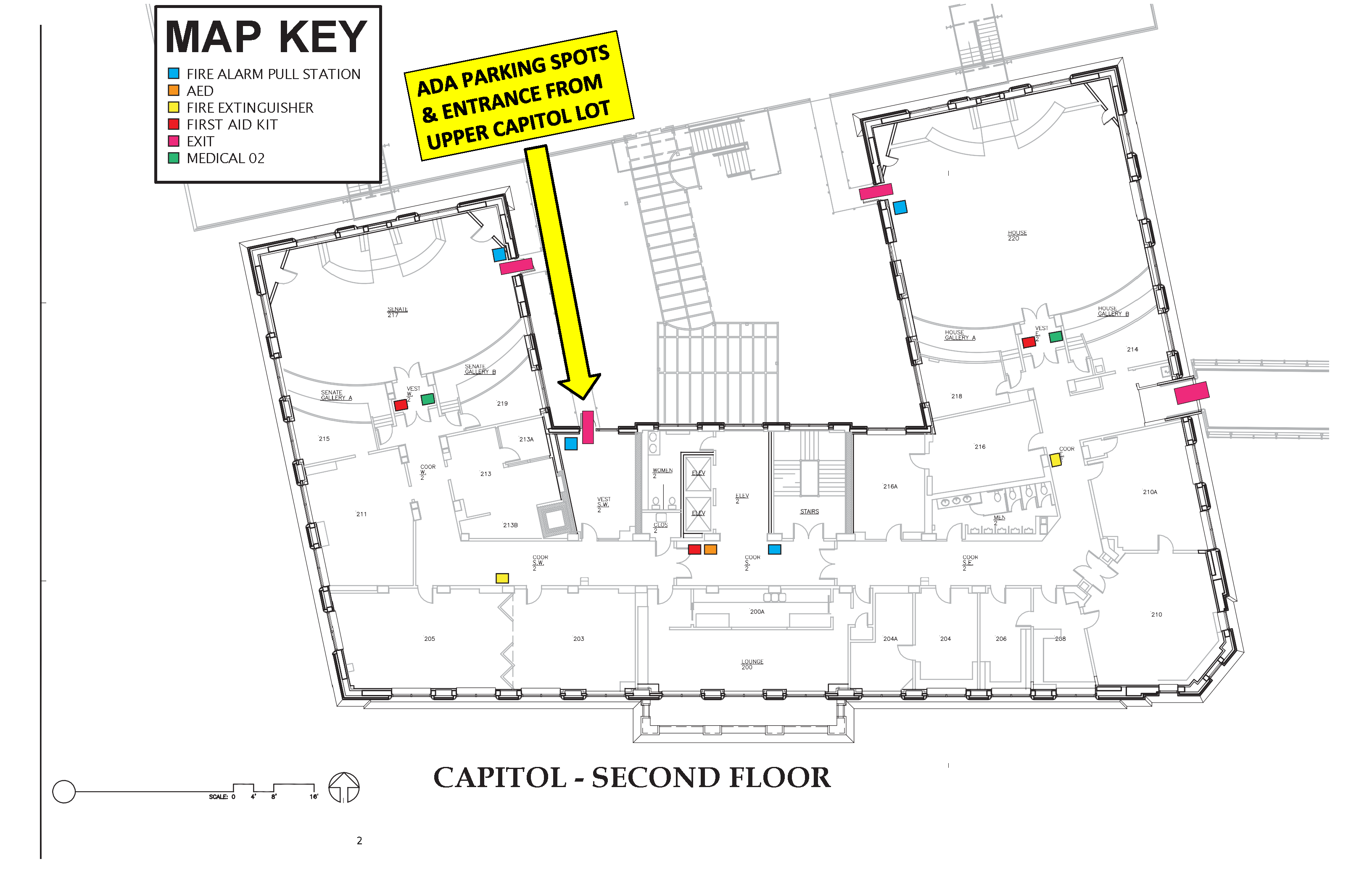 The Capitol has two wheelchair/accessible entrances. A ramp and powered doors are located at the main ground floor lobby entrance on 4th street. An additional accessible entrance with a powered door is located at the rear of the building off 5th street; this entrance is keycard access only and those without a keycard will need to contact Capitol Security at (907) 465-1414 to use this option.